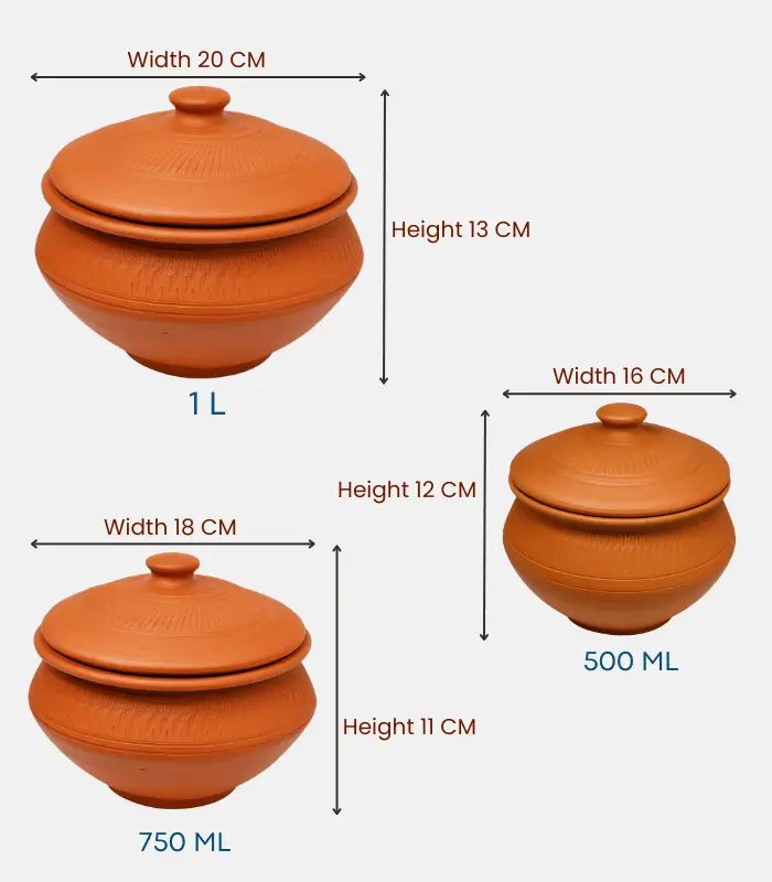 Set of 3 Terracotta Clay Biryani Handi with Lid (1L, 750ml & 500ml) | Traditional Clay Cookware | Kitchen & Serving Use